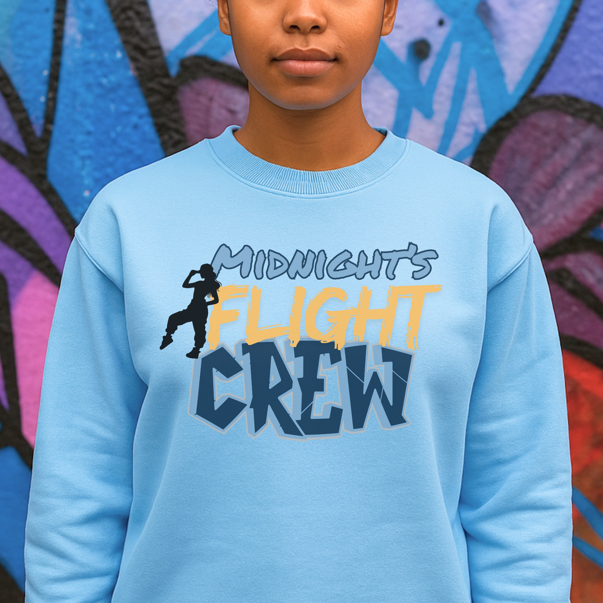 Step out in comfort and confidence with the Midnight’s Flight Crew sweatshirt! Featuring a bold graphic design with standout lettering and dancer silhouette, this sweatshirt brings energy and team pride to your everyday style.